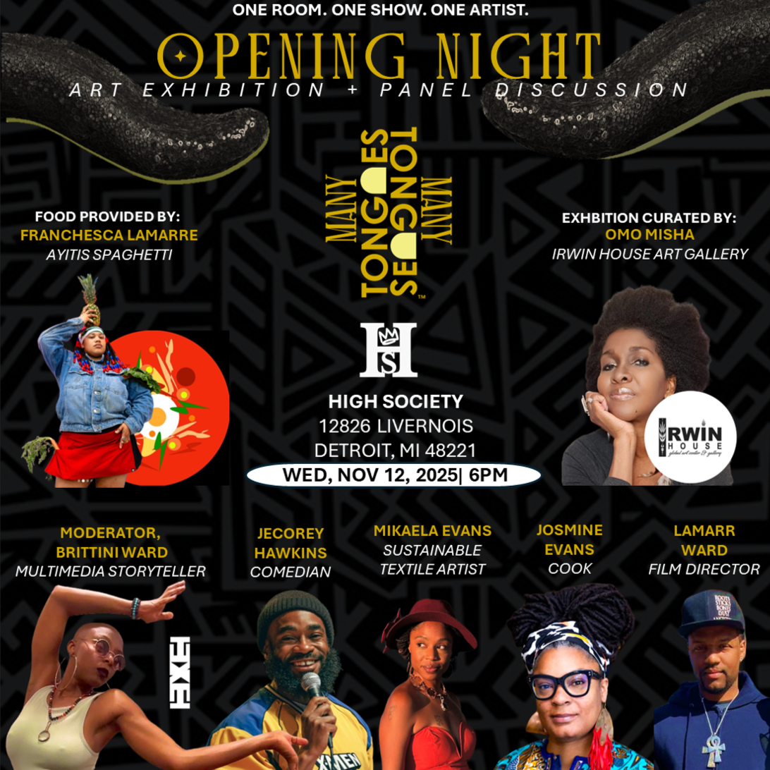 Many Tongues™ is an immersive storytelling exhibition that explores how narrative transcends form — unfolding through food, poetry, comedy, visual art, fashion, film, and performance. Curated by Misha McGlown (Omo Misha) and created by Brittini Ward (Eye N Eye the Storyteller), the exhibition transforms High Society (12826 Livernois, Detroit) into a living archive of sound, taste, image, and memory. Each activation — from culinary storytelling and live comedy to spoken word, fashion talks, and visual installations — invites audiences to experience language in its many expressions.