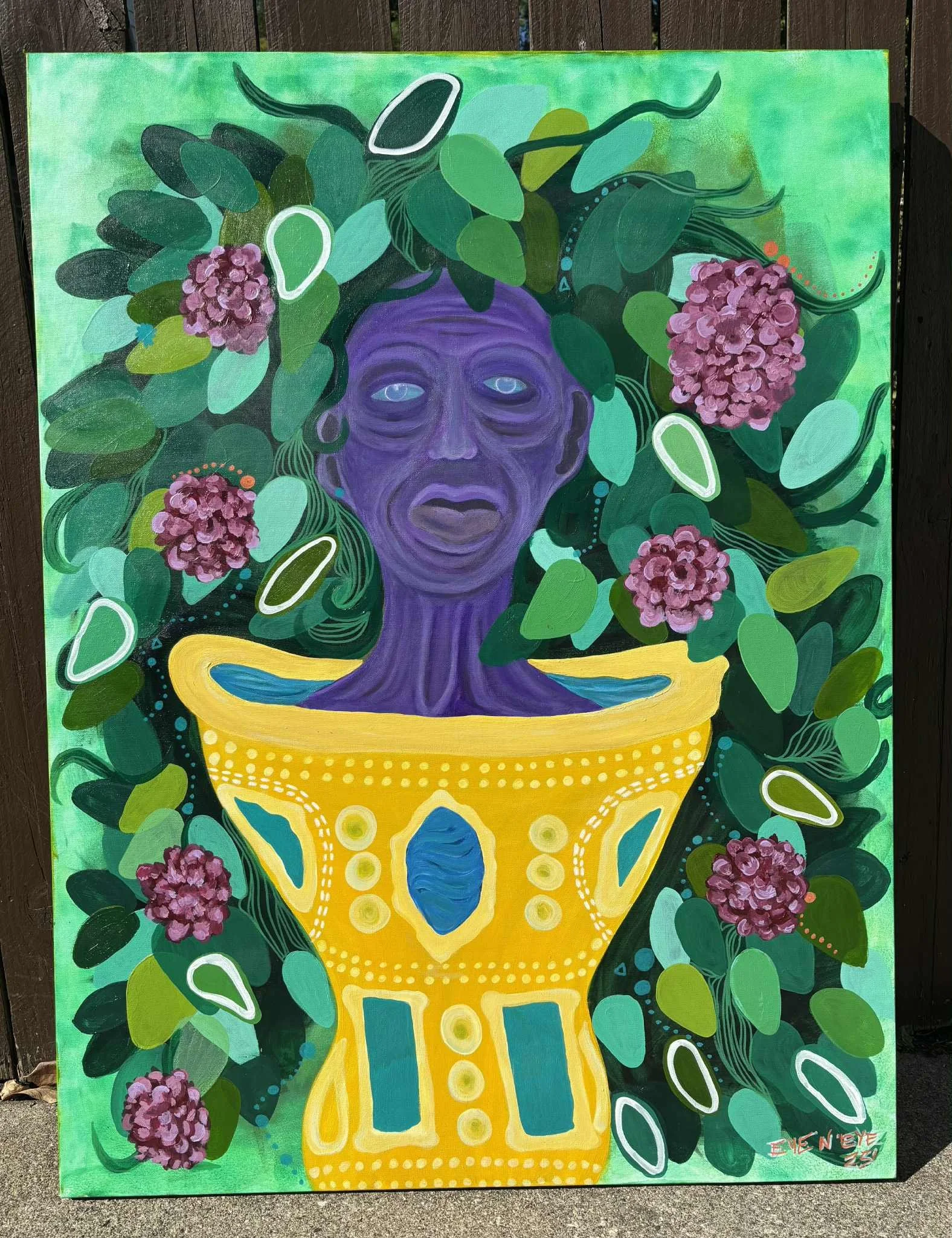 Original canvas work and books by Eye N Eye. Every piece is rooted in memory, altar work, and lived experience. Nothing here is mass-produced.